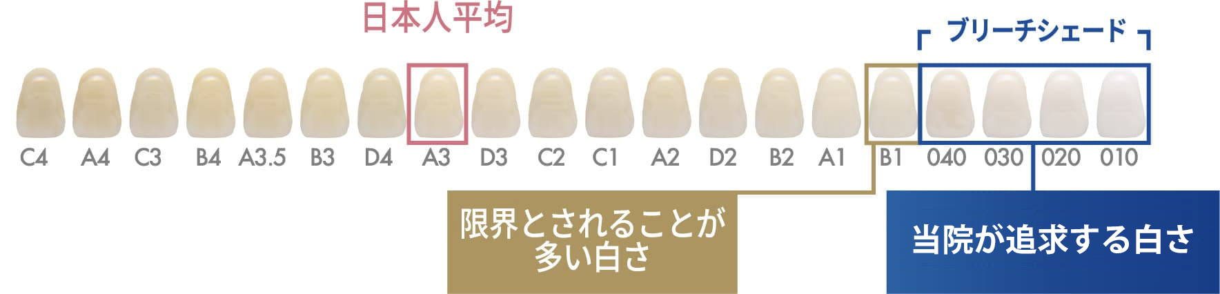 当院のホワイトニングは限界とされるB1の4段階上の040以上のブリーチシェードを目指すことができます。